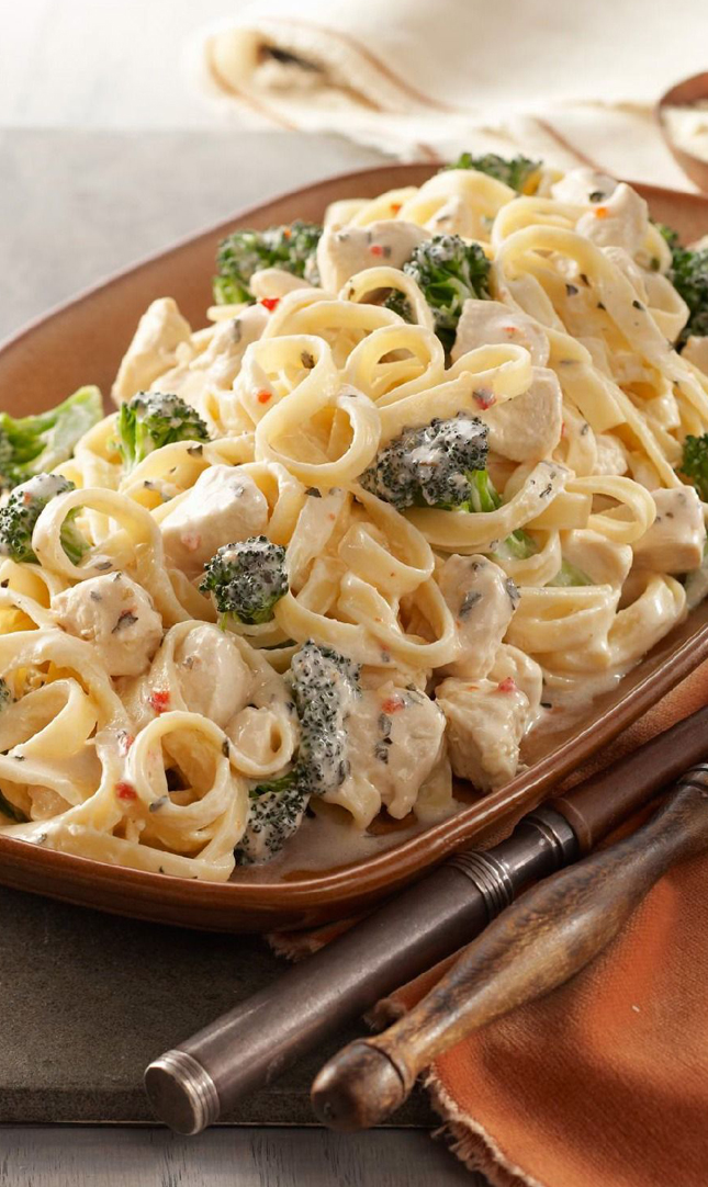 Jülyen tavuk parçaları, fesleğen sosu, renkli biber, krema sos, parmesan peyniri ile.