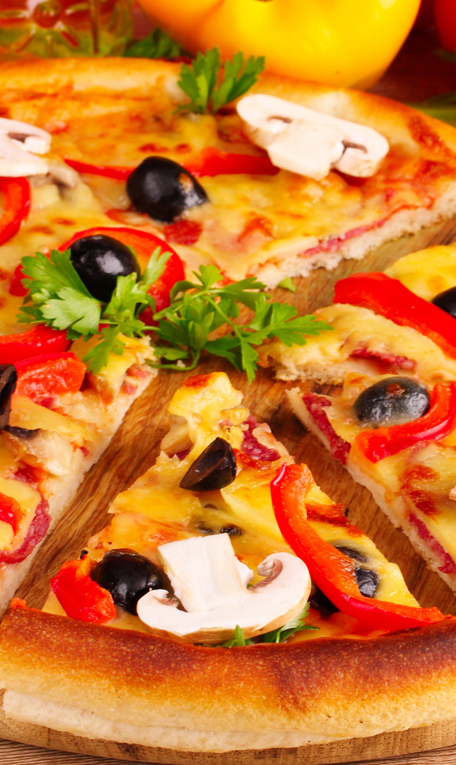 Kaşar, domates, biber, mantar ve mısır eşliğinde.
