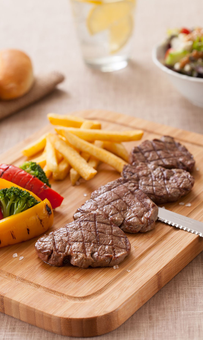 Özel baharatlar ve sızma zeytinyağında bekletilerek marine edilmiş dana bonfile, sebze garnitür ve patates püresi ile.