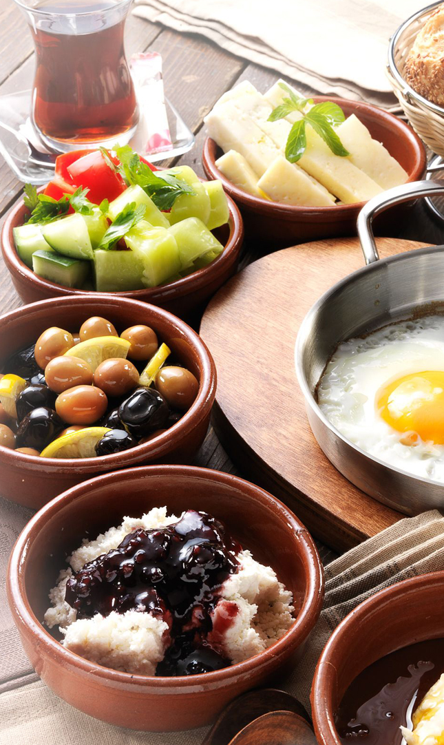 Süt Reçeli, Biber Reçeli, Siyah ve Yeşil Zeytin, Kırma Zeytin, Örgü Peynir, Lavaş Peynir, Van Otlu Peyniri, Sigara Böreği, Patates Cipsi, Göz Yumurta, Bal ve Kaymak, Yeşillik ve Söğüş ile.