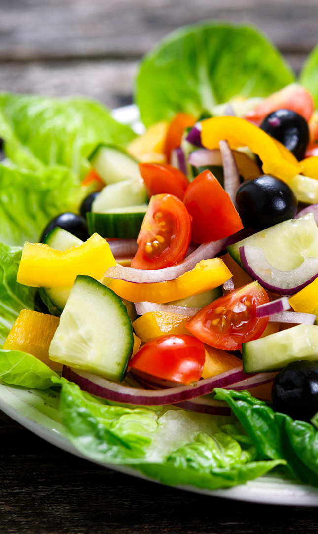 Kızartılmış tortilla yatağında akdeniz yeşillikleri, kayısı, kuru üzüm ceviz ve sotelenmiş tavuk parçaları ile servis edilir.