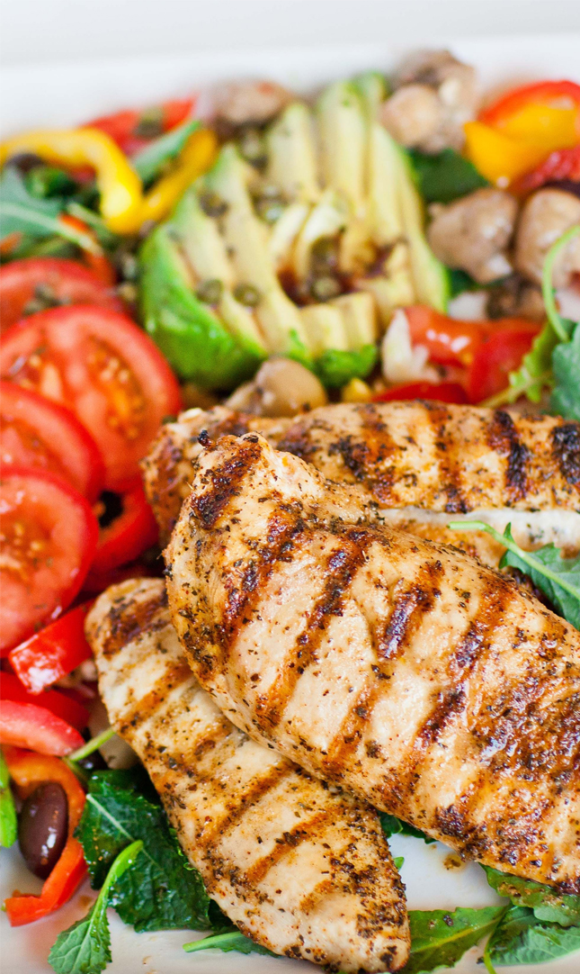 Dilimlenmiş ızgara tavuk fileto, göbek marul, kroton ekmek, hardal, sezar sos, maydanoz, roka, salatalık, kırmızı kapya biber ve domates ile servis edilir.